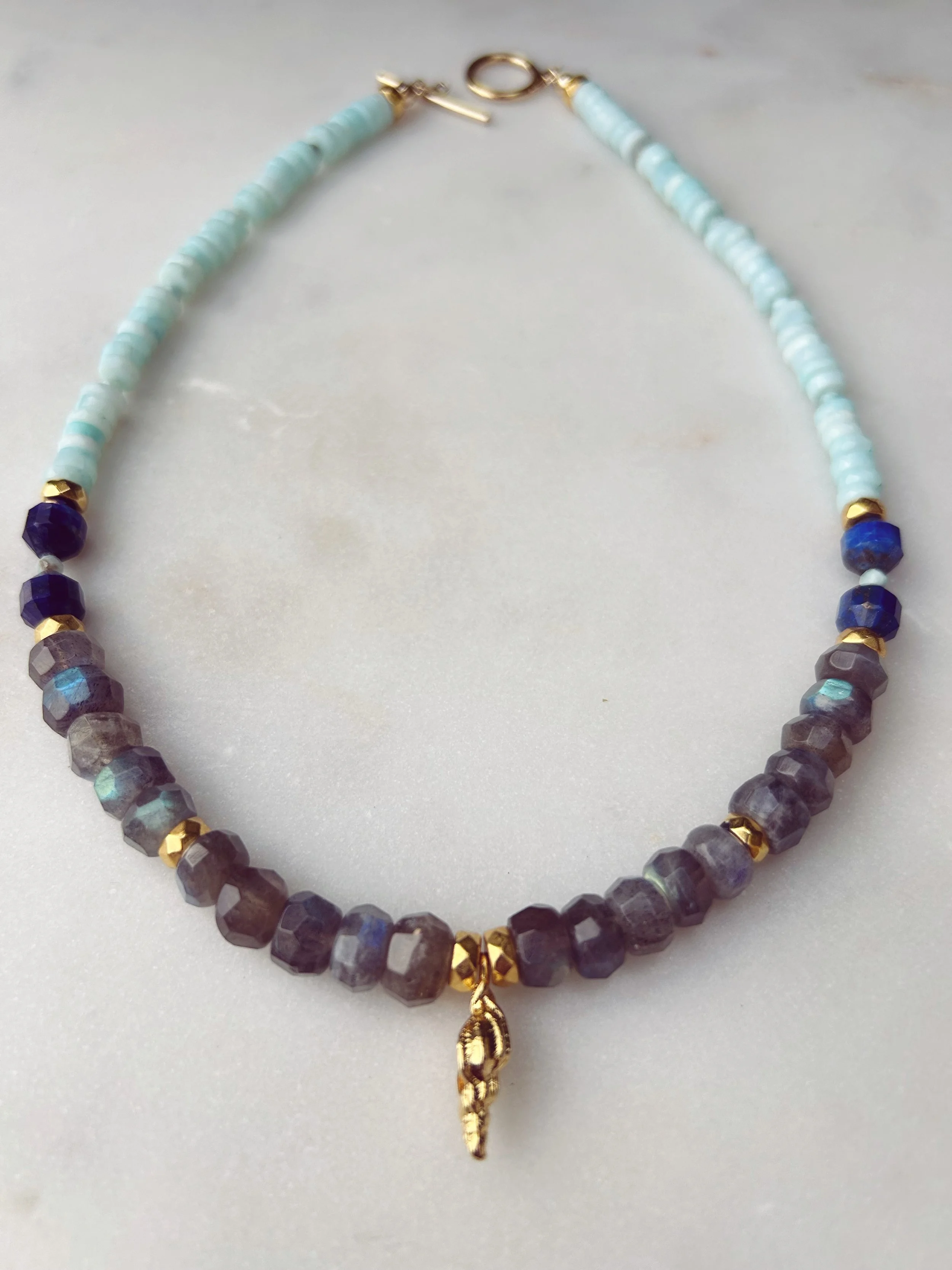 Faceted Labradorite beads + faceted Lapis Lazuli beads + Peruvian Opal heishi beads with 18k gold plated spacer beads and micro faceted Larimar beads. Ended with an 18k gold plated toggle clasp.